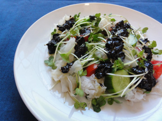 *写真のサラダは、戻した白きくらげ、きゅうり、プチトマト、貝割れ大根を具にしています。