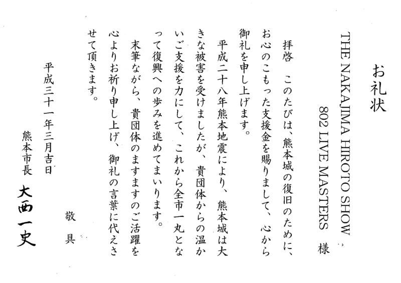 熊本城災害復旧支援金として寄付させていただきました。