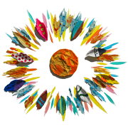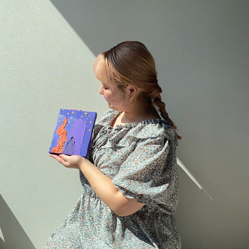 凹凸のある絵肌が特徴で、風景や生き物に感情を委ねて表現する。夢心地に生きる建物や生き物は、鑑賞者をいつも暖かく歓迎し見守っている。