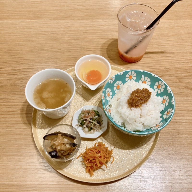 自家製の甘麹、旨塩麹、醤油麹をお料理やスイーツ、ドリンクに取り入れていらっしゃいます。モーニングメニューから、私は『山梨県中村養鶏場のTKG醤油麹付き』をセレクトしました。ご飯の上に醤油麹がトッピング、季節ごとに餌を変え、栄養価の高いオーナーが惚れ込んだ卵、季節の野菜を使った副菜3種類、スープがセットになっています。