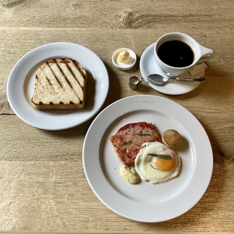 モーニングメニューから、私は『炭焼きトースト 麹バター 目玉焼きとポテト入りソーセージ』をセレクト!!炭火で30 秒程焼いたトーストは、外はパリッと、中はもちふわ。佐々木酒造のべっぴん米麹、淡路島の藻塩、グラスフェッドバターを合わせ、ホイップしたふわっふわのバターをたっぷりつけていただきます。ハーブと共に焼き上げられた目玉焼き、オーブンで焼いてくださる、ジューシーで角切りのじゃがいもが練り込まれたソーセージもトーストとの相性抜群です!!