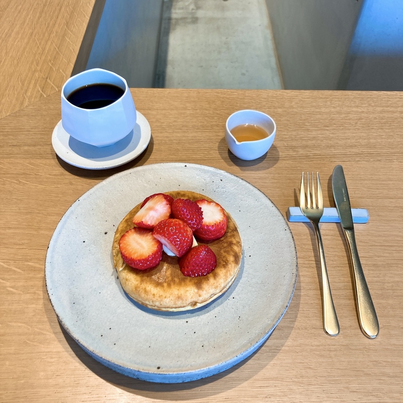 ホットケーキの上に発酵バター、さらに、春はいちごのトッピングもできます!!まずはバターを溶かし、ひとくち。卵の香りは広がり、ふわふわ、しっとり。その後に、自家製シロップをたっぷりかけて。シロップがふわふわの隙間に染み込んで、じゅわっと広がるやさしい甘さ。いちご・紅ほっぺの濃厚で、やわらかな果肉。いちごの甘さを邪魔しない、シロップの上品な甘さ♡素晴らしいです!!