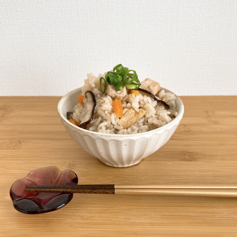 米2合、切り餅1つ(30g)、椎茸2個、人参1/2本、油揚げ1/3枚、刻みネギ少々、