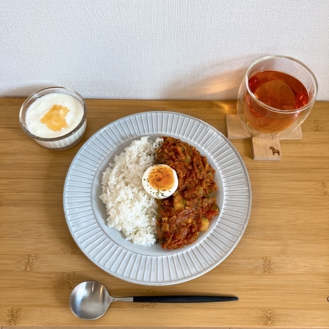 ④ご飯にカレーをかけ、茹で卵をトッピンングしたら、出来上がり!!