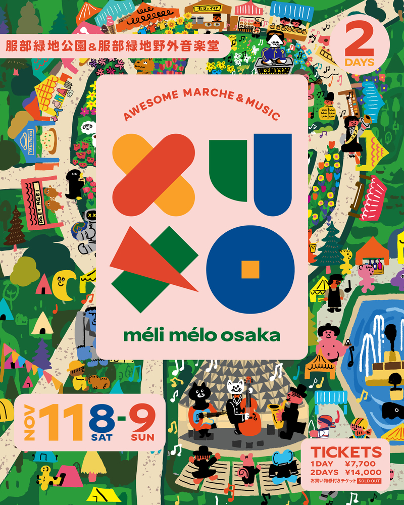 | 料金詳細 | 【méli mélo hall(野外音楽堂)】有料エリア 1DAY:¥7,700-/2DAYS通し券:¥14,000- 1DAY 小中学生チケット:¥1,500-/2DAYS通し券 小中学生チケット:¥3,000- 【arcade】【shop】【food】【workshop】は無料エリアとなります |